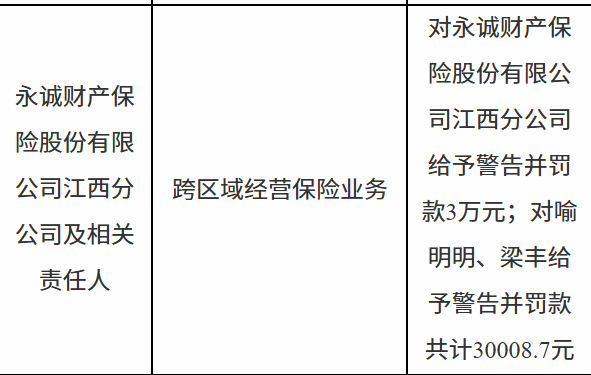 11月14日红太阳配资,国家金融监督管理总局江西监管局行政处罚信息公开表显示,永诚财产保险股份有限公司江西分公司及相关责任人因跨区域经营保险业务被警告并罚款3万元;喻某明、梁某被警告并罚款共计30008.7元。