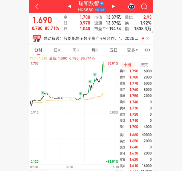 上证报中国证券网讯(记者 李五强)1月26日中博证券,瑞和数智午后强劲拉升,截至15时11分,报1.69港元/股,涨85.71%。
