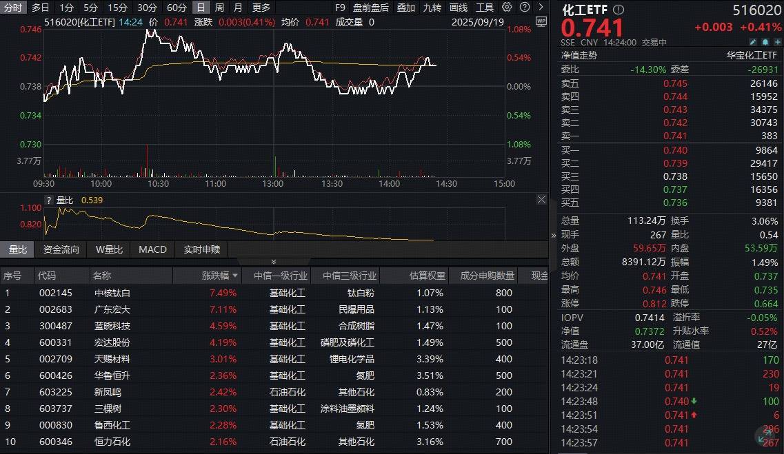 化工板块今日(9月19日)震荡走高!反映化工板块整体走势的化工ETF(516020)全天多数时间红盘震荡伯乐配资,截至发稿,场内价格涨0.41%。